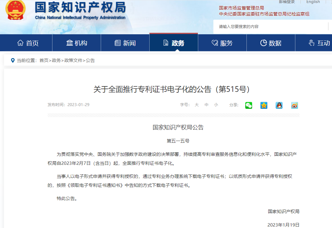其中提到,為貫徹落實黨中央、國務院關于加強數(shù)字政府建設的決策部署,持續(xù)提高專利審查服務信息化和便利化水平,國家知識產(chǎn)權局自2023年2月7日(含當日)起,全面推行專利證書電子化。