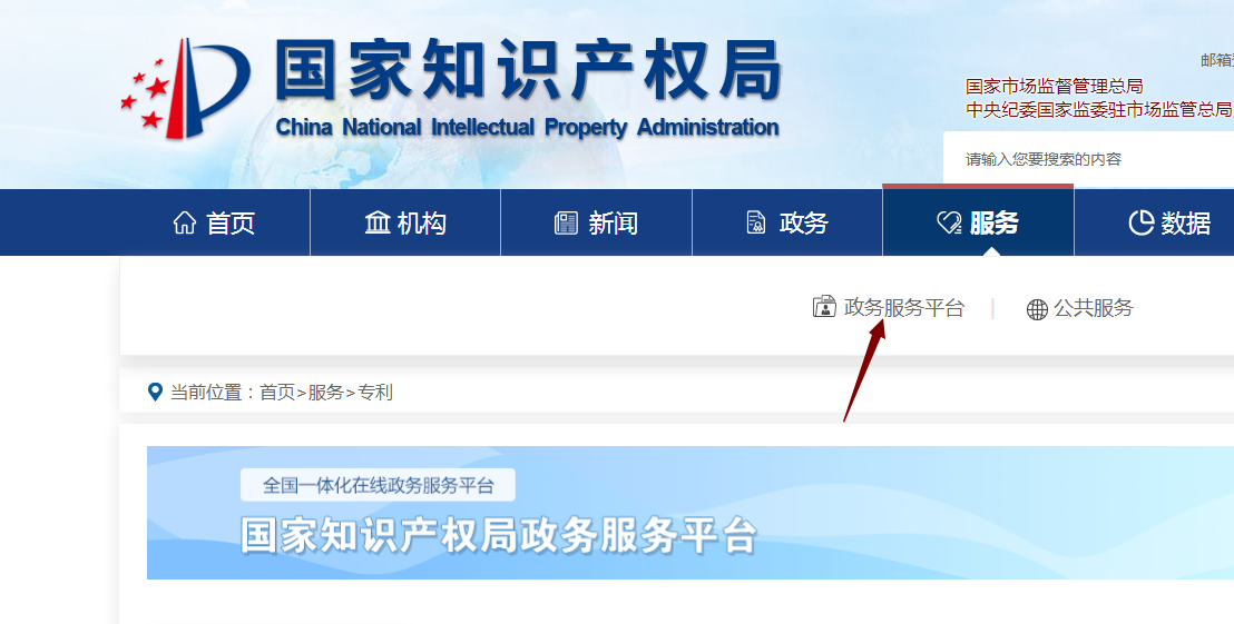 (1)登入國(guó)家知識(shí)產(chǎn)權(quán)局官網(wǎng),進(jìn)入政務(wù)服務(wù)平臺(tái)