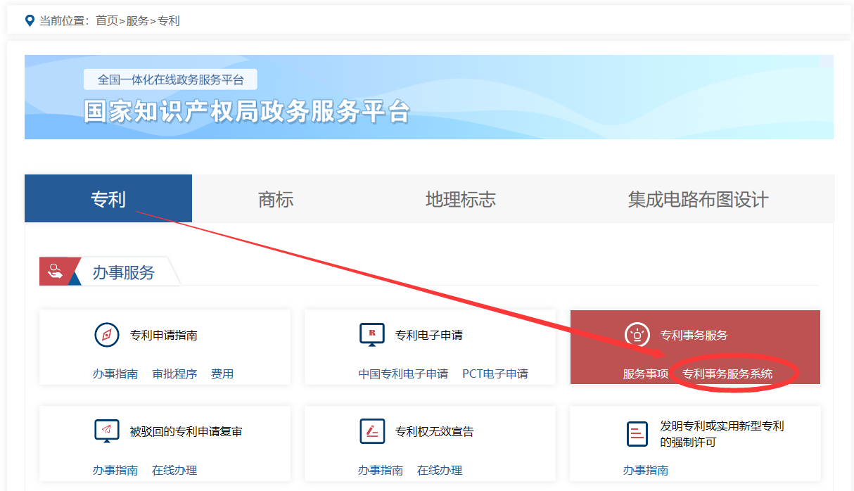 (2)選擇進(jìn)入“專(zhuān)利事務(wù)服務(wù)系統(tǒng)”