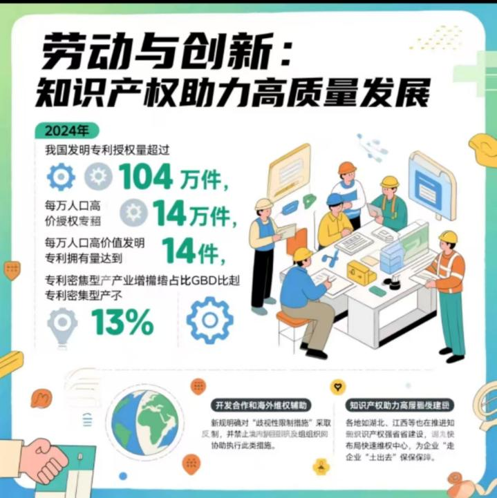 2024年的數(shù)據(jù)顯示,我國發(fā)明專利授權(quán)量超過104萬件,每萬人口高價值發(fā)明專利擁有量達(dá)到14件,專利密集型產(chǎn)業(yè)增加值占GDP比重超過13%。這些數(shù)字背后,是無數(shù)勞動者的智慧成果。我國正加速建設(shè)知識產(chǎn)權(quán)強(qiáng)國,深化國際合作與海外維權(quán)援助。例如,新規(guī)明確對“歧視性限制措施”采取反制,并禁止境內(nèi)組織協(xié)助執(zhí)行此類措施。各地如湖北、江西等也在推進(jìn)知識產(chǎn)權(quán)強(qiáng)省建設(shè),布局快速維權(quán)中心,為企業(yè)“走出去”保駕護(hù)航。這些舉措不僅提升了我國在全球知識產(chǎn)權(quán)領(lǐng)域的地位,也為創(chuàng)新者提供了更加有力的法律支持。